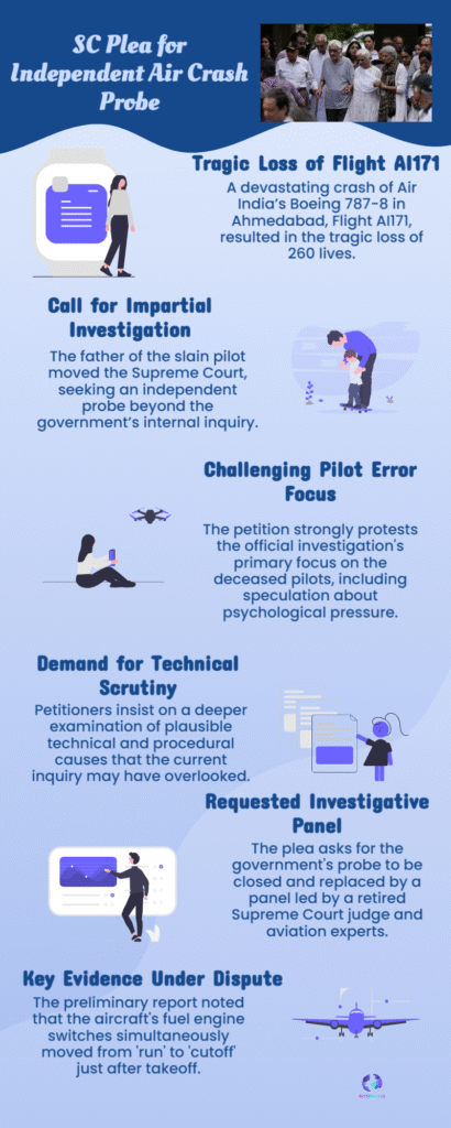 The father of Air India pilot Sumeet Sabharwal has filed a petition in the Supreme Court seeking an independent, judicially led inquiry into the Ahmedabad crash that killed 260 people on June 12, arguing the government probe has focused disproportionately on pilot error and ignored plausible technical and procedural causes. The petition requests a panel headed by a retired Supreme Court judge with aviation experts as members to re-open and broaden the investigation.