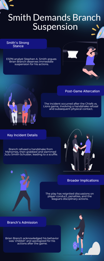 Stephen A. Smith calls for Brian Branch’s immediate suspension after a postgame fight with JuJu Smith-Schuster in Chiefs-Lions; NFL review and fallout explained.