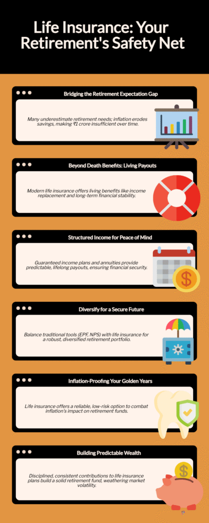 Ultimately, life insurance is not a one-size-fits-all solution, but when used correctly it becomes a powerful pillar of a retirement plan: guaranteeing steady income, protecting dependents, and adding discipline through regular contributions. For most Indians, the goal should be a balanced approach that combines statutory benefits (EPF, gratuity), market growth (equities, mutual funds) and insurance-backed certainty (annuities, guaranteed plans). Starting early and reviewing regularly remains the most dependable route to a retirement that is about thriving, not just surviving.