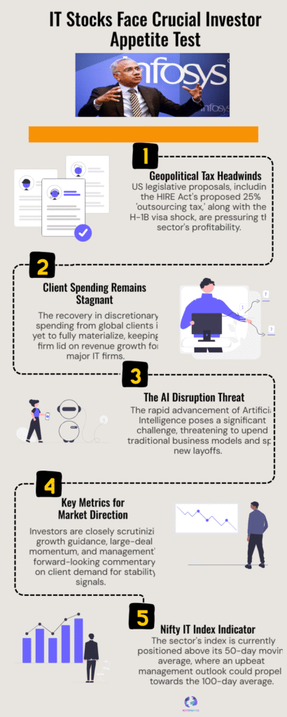 Market technicians note the NSE Nifty IT Index remains above its 50-day moving average, and a confident outlook from Infosys and Wipro could drive a move toward the 100-day average — a technical shift that would attract momentum buyers. Conversely, cautious guidance or weaker-than-expected large-deal updates would likely trigger profit-taking, given recent volatility in IT valuations and concerns around client discretionary spend. Investor focus will therefore be both quantitative — revenue, margins, order books — and qualitative — management tone on demand and deal momentum.