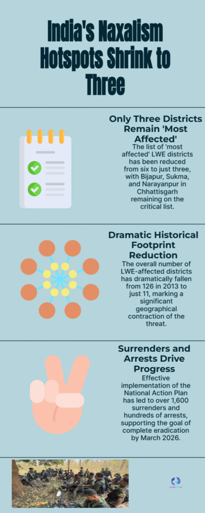 Government says Naxalism has shrunk to three “most-affected” districts — Bijapur, Sukma and Narayanpur — with LWE presence falling from 126 districts in 2013 to 18 now. Read a clear 600-word analysis of statistics, policy, security gains and remaining challenges.