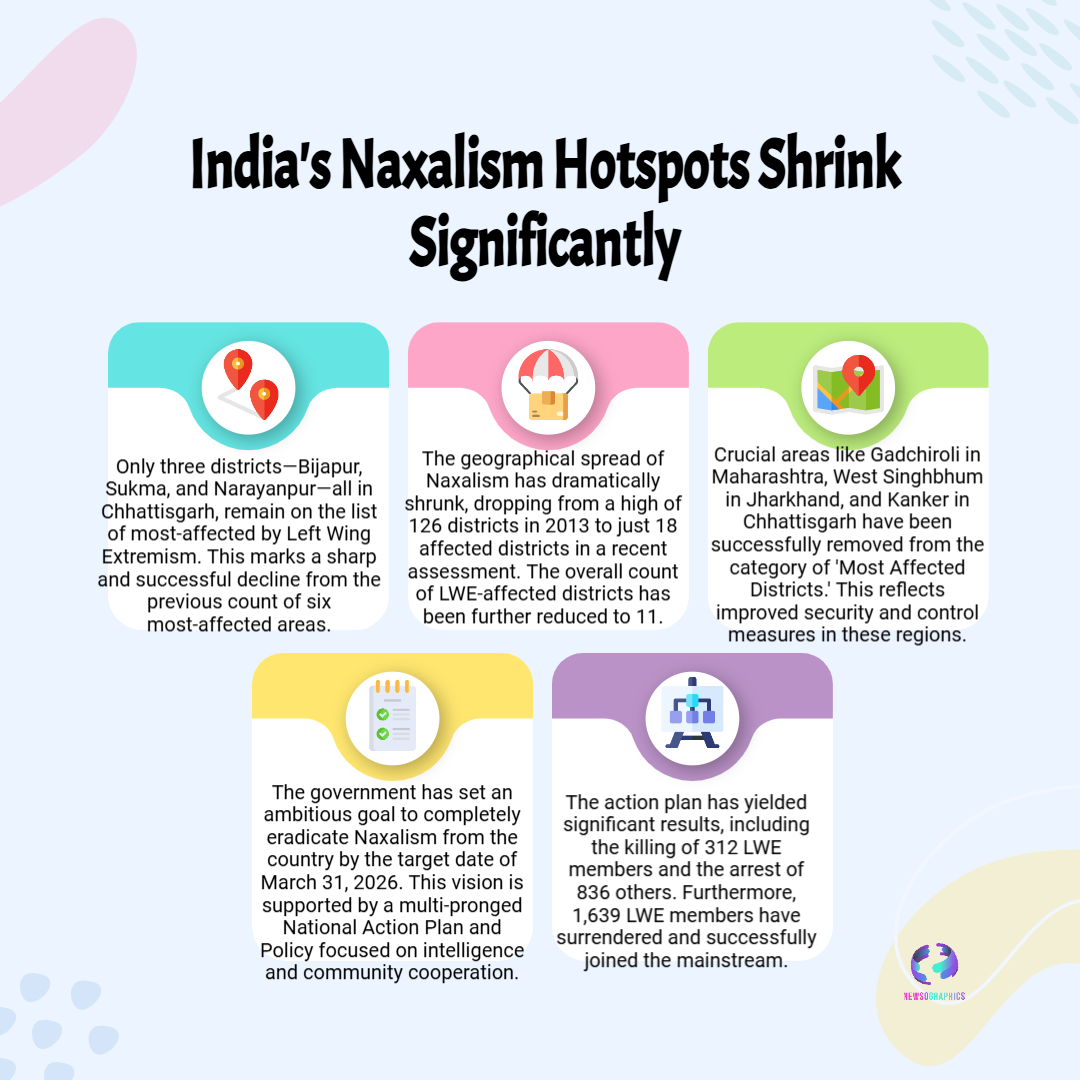 Government says Naxalism has shrunk to three “most-affected” districts — Bijapur, Sukma and Narayanpur — with LWE presence falling from 126 districts in 2013 to 18 now. Read a clear 600-word analysis of statistics, policy, security gains and remaining challenges.