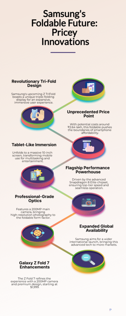 Samsung’s trifold flagship Z TriFold may cost around ₹2.64 lakh (~$3,000). Read full specs, expected launch timeline, India availability and how it compares to Huawei’s Mate XTs.