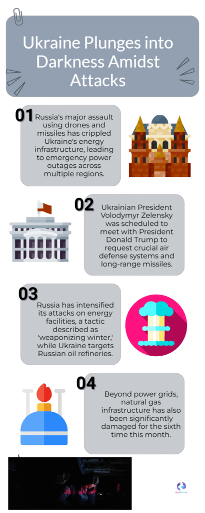 A massive Russian drone-and-missile assault on Ukraine’s energy infrastructure on October 16–17, 2025, knocked out power and damaged key gas sites across several regions, plunging cities into darkness ahead of President Volodymyr Zelensky’s White House visit to meet President Donald Trump. Ukrainian grid operator Ukrenergo and company officials reported widespread emergency outages while repair crews scrambled to restore supply as winter approaches. The strikes targeted generation, transmission and gas-processing facilities, the sort of deliberate campaign analysts say aims to “weaponize winter” by degrading heating and electricity ahead of peak demand.